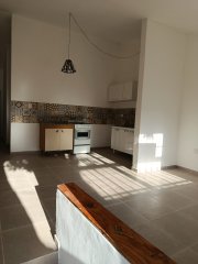 Departamento con ingreso directo desde calle y sector de guardado vehicular (con ingreso por el pasaje lateral) Living comedor con cocina integrada (con muebles y mesadas nuevos, y artefactos de cocina y calefón en optimo estado); baño con ducha y ventilación natural; dormitorio sin placard; patio cerrado (tipo jardin de invierno); segundo patio abierto (piso de cemento alisado y cantero para plantas); y sector de jardín o espacio para estacionamiento de vehículo (descubierto). Pisos cerámicos. Servicios conectados.